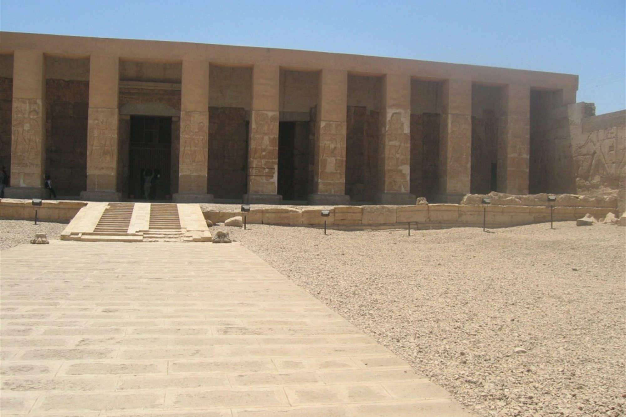 El primer tramo del recorrido nos lleva hasta Abidos, a unos 170 km al norte de Lúxor (aproximadamente 2 h 30 min por carretera). Esta ciudad fue uno de los centros religiosos más importantes del antiguo Egipto, lugar de culto del dios Osiris, señor del más allá y símbolo de la resurrección. Visitamos el impresionante Templo de Seti I, una de las obras maestras del arte faraónico. Construido en el siglo XIII a.C., este santuario destaca por sus relieves profundamente grabados, su atmósfera de recogimiento y su perfecta simetría. En su interior encontramos escenas mitológicas, rituales y la famosa Lista Real de Abidos, que recoge los nombres de 76 faraones, testimonio del respeto a la tradición dinástica. El templo también encierra un aura mística: se creía que aquí reposaban los restos de Osiris, lo que lo convirtió en un centro de peregrinación durante siglos.