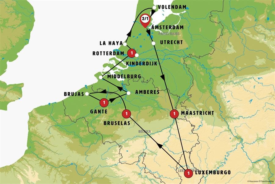 Muy próximo a Gante, temprano, nos dirigimos a BRUJAS, joya medieval Patrimonio de la Humanidad, con canales espejados y casas gremiales que conservan un aire de cuento. Tiempo para caminar o si lo desea para tomar un barco por sus canales. Tras ello, tiempo para pasear y almorzar en SLUIS (La Esclusa), encantador pueblo fortificado que conserva restos de sus murallas medievales y un antiguo molino. Continuamos hacia Países Bajos, donde realizaremos una parada en MIDDELBURG, la tranquila y agradable capital de la provincia de Zelanda, donde destaca su ayuntamiento gótico. Seguidamente tomamos la carretera N57, sobre esclusas y barreras que marcan el límite del “Plan Delta”, maravilla de la ingeniería hidráulica holandesa. Llegaremos a ROTTERDAM al final de la tarde para descubrir la segunda mayor ciudad de los Países Bajos que alberga el mayor puerto de Europa y que destaca por su arquitectura moderna y su vibrante ambiente cosmopolita.