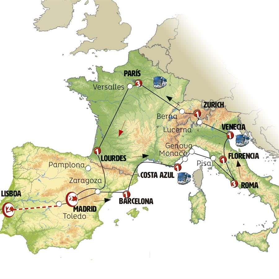 Salimos siguiendo el valle del Po hacia SUIZA. Etapa de gran belleza paisajística entrando en la región de los lagos Alpinos. LUGANO, tiempo para almorzar y pasear por la capital de la región Suiza de habla Italiana, a la orilla del gran lago. Tras la hora del almuerzo cruzamos los Alpes por el túnel de San Gotardo. LUCERNA, llegada a media tarde. Tiempo para conocer esta hermosísima ciudad Suiza a la orilla del lago de los cuatro cantones. ZURICH, llegada al final de la tarde, un paseo junto a su lago.