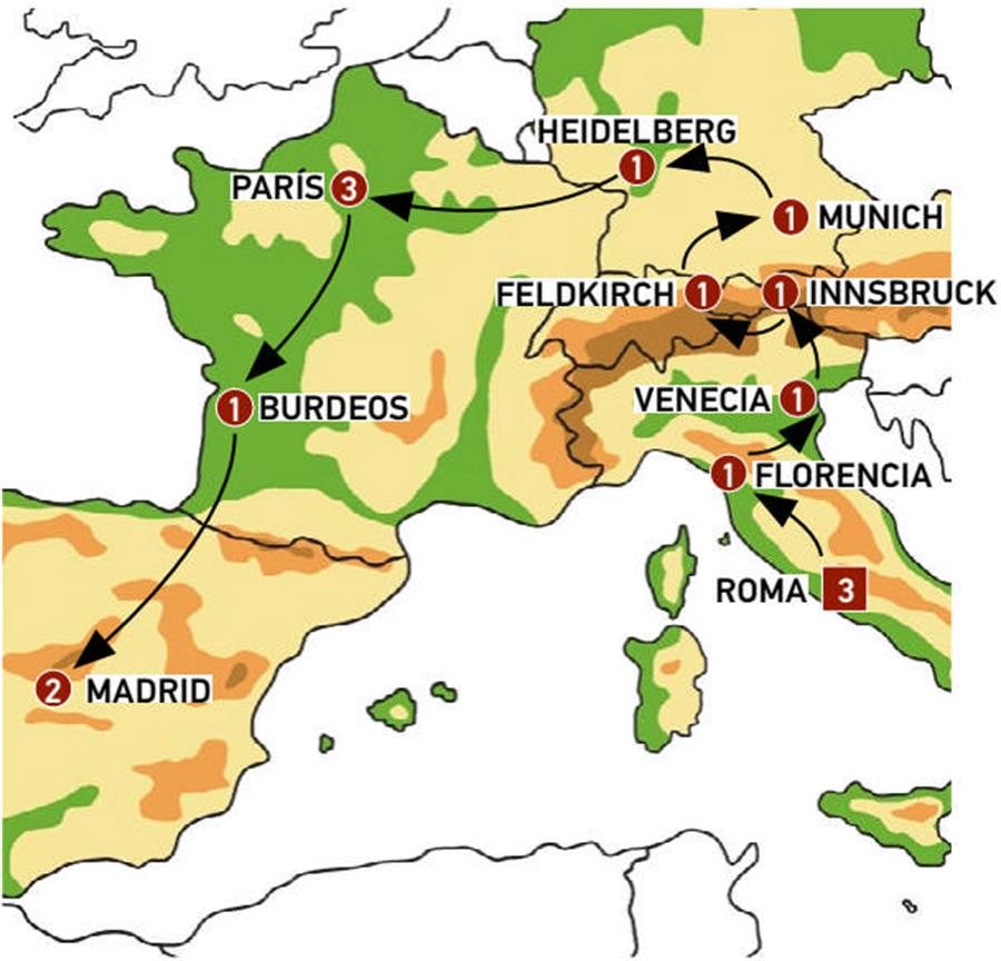 Tour por Europa en autobús, recorriendo las principales ciudades de Italia, Austria, Alemania, Francia y España.