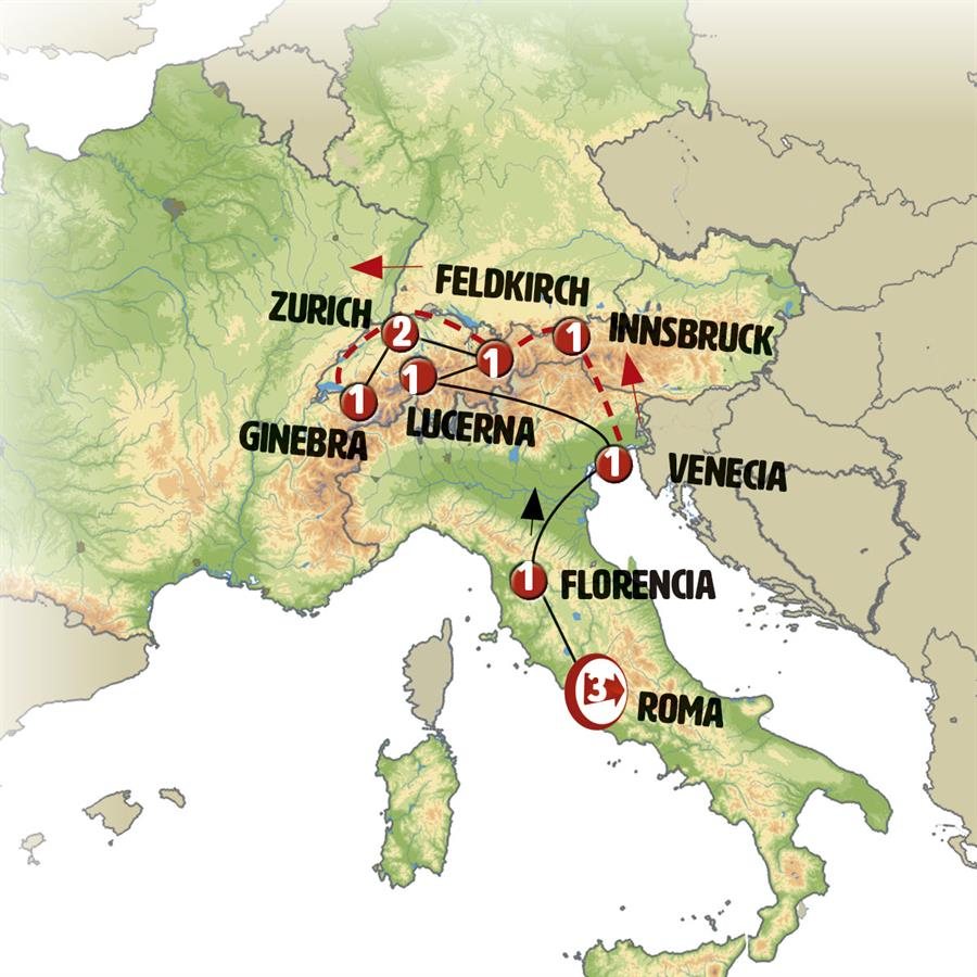 Viaje por Italia, Suiza y el Tirol con visitas incluidas. No incluye vuelos internacionales por lo que es ideal para combinar con vuelos low cost o volar desde/hasta cualquier parte del mundo.