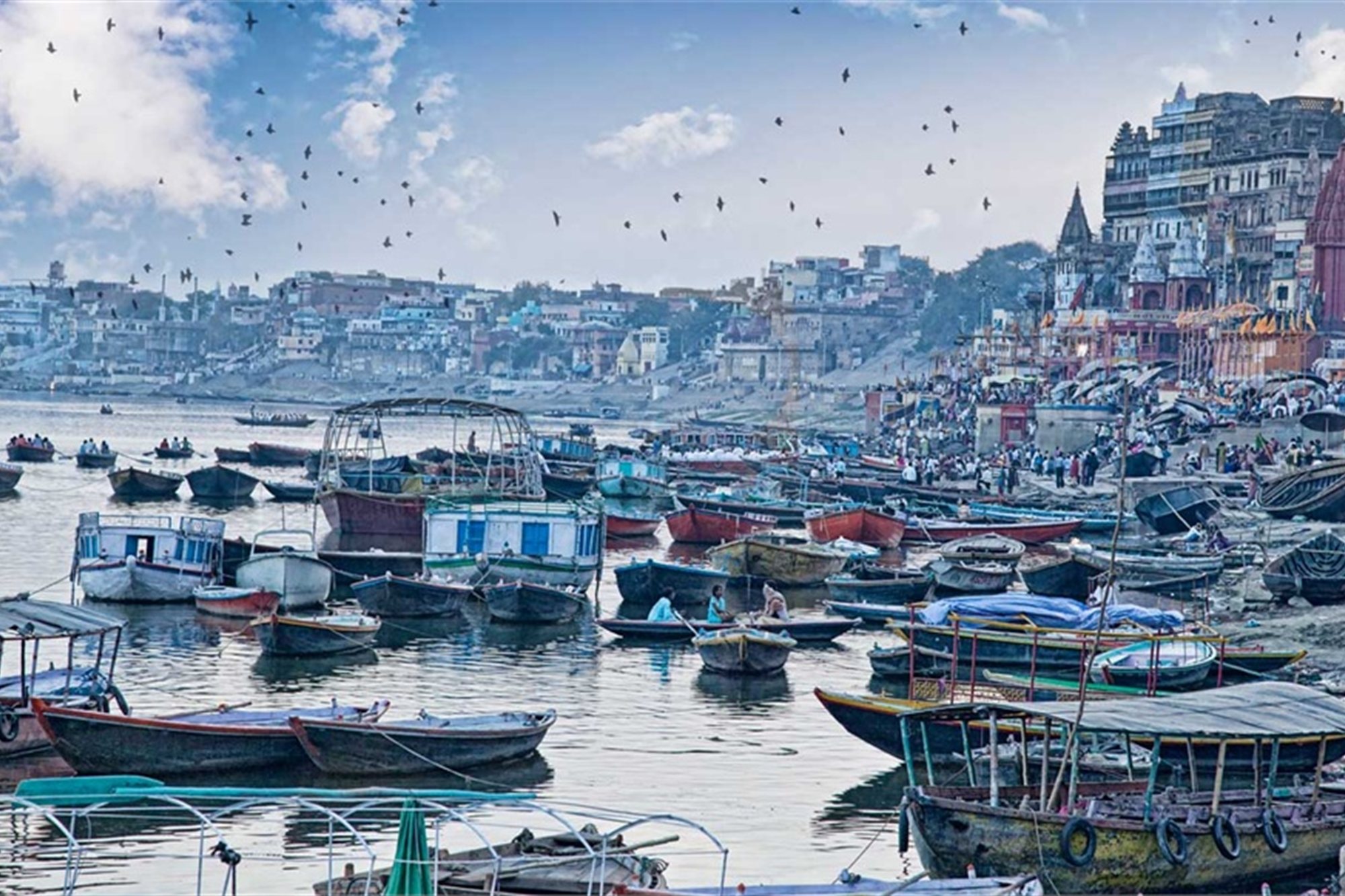 De madrugada, paseo en barca por el sagrado río Ganges para ver los "Ghats" o baños rituales, y los lugares de cremación. Contemplar a los creyentes bañarse y adorar al río en los Ghats es una de las experiencias más extraordinarias que un viajero puede disfrutar en la India. Millones de peregrinos acuden para purificarse en las aguas del rio, asistir a antiguos ritos, consultar astrólogos y expulsar el Karma negativo. Andaremos por las callejuelas del caso antiguo para ver la profundidad de la religión hindú en la vida cotidiana de la gente. Pasaremos por el templo Durga, el Tulsi Manas Mandir, la Universidad Hindú Benarés. Regreso al hotel y desayuno. Excursión a Sarnath, la ciudad budista sepultada, donde Buddha dió su primer sermón. Sarnath fue un renombrado centro de aprendizaje desde el siglo VI A.C. hasta el siglo XII D.C. Visita de las ruinas, la Stupa, el Templo Budista y el Museo. Cena y alojamiento.