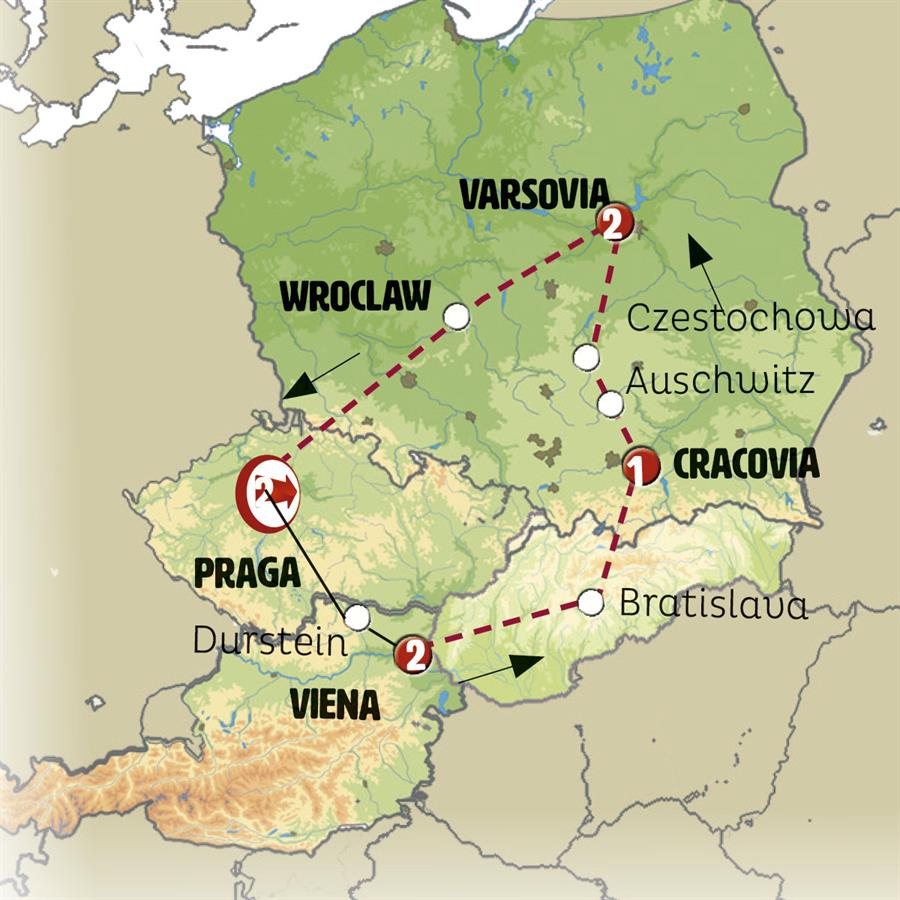 A tan solo 65 Km. de Viena se encuentra BRATISLAVA, la capital del país a orillas del Danubio. Tiempo para dar un paseo por su casco histórico al pie del imponente castillo.. Tras ello continuamos hacia TRENCIN, pequeña ciudad medieval al oeste de Eslovaquia, con un impresionante castillo y un activo y pintoresco centro. Tiempo para pasear y almorzar. Por la tarde continuamos nuestra ruta entre paisajes de bosques y colinas hacia Polonia. Llegada a CRACOVIA al final del día.