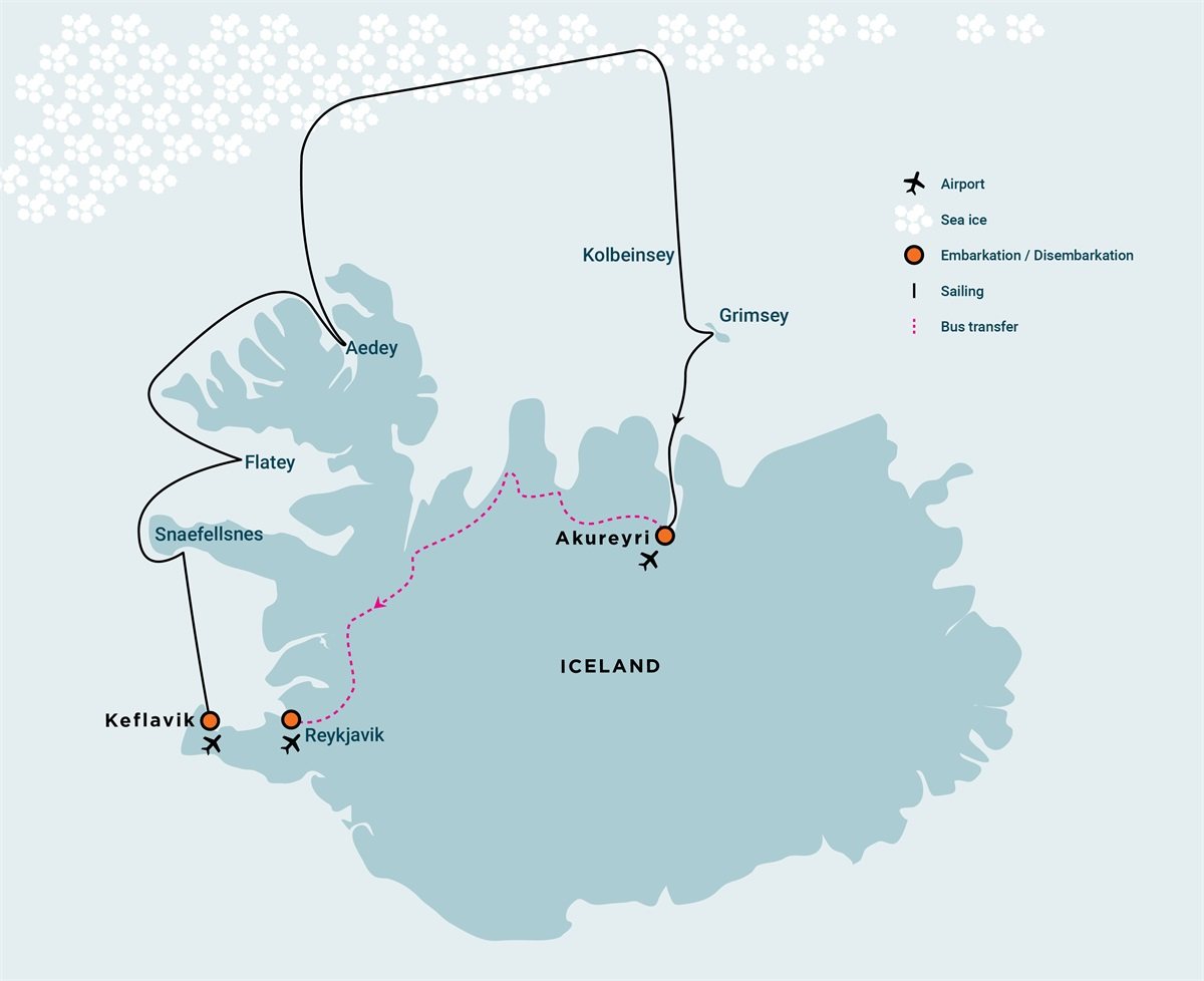Una vez finalizado nuestro viaje, desembarcará en Akureyri, donde, si lo solicita, podrá trasladarse en un autobús fletado (un trayecto de seis horas que deberá reservar con antelación) hasta la parada de la Sala de Conciertos y Centro de Conferencias Harpa, en Austurbakki, Reikiavik. Aunque su estancia en el Ártico haya terminado, sus recuerdos y experiencias le acompañarán para siempre
