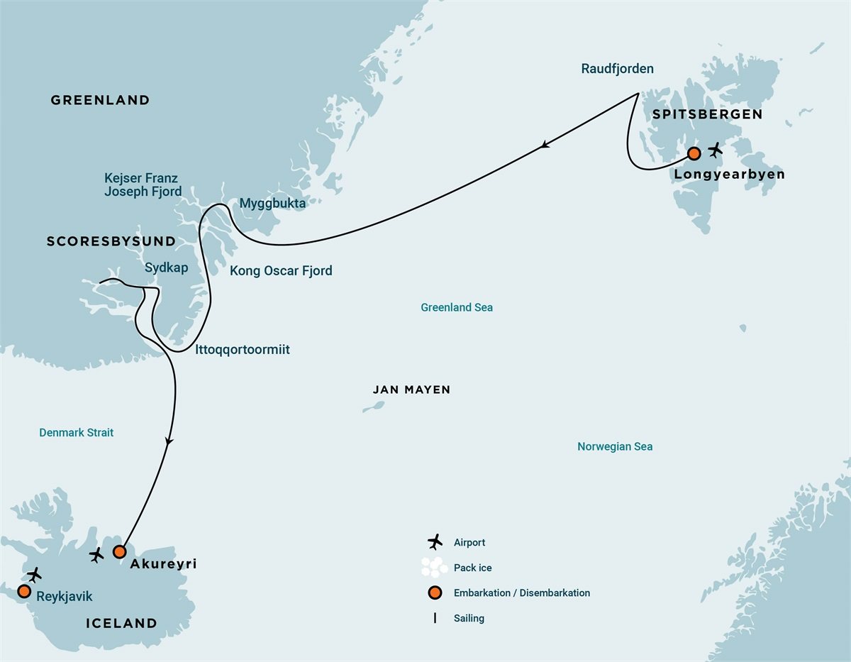 La probabilidad de navegar en Scoresbysund es alta (según nuestras experiencias desde 1993 hasta 2019), pero aún existe la posibilidad (alrededor del 10%) de que el hielo obstruya el paso al sistema de fiordos. Este itinerario es sólo orientativo. El programa puede variar en función del hielo, el tiempo y las condiciones de la fauna. Los desembarcos están sujetos a la disponibilidad del lugar, a los permisos y a los problemas medioambientales según la normativa de AECO. Los planes oficiales de navegación y las franjas de desembarco se programan con AECO antes del inicio de la temporada, pero el líder de la expedición determina el plan final. La flexibilidad es primordial para los cruceros de expedición. La velocidad media de crucero para nuestro buque es de 10,5 nudos.