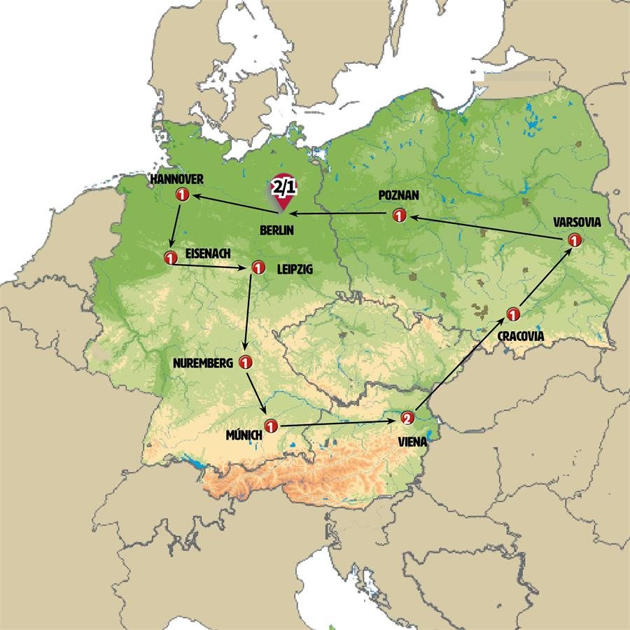 Saliendo de Leipzig, haremos una parada junto al Monumento a la Batalla de las Naciones, inaugurado en 1913 y con una altura de 91 metros, que conmemora una célebre batalla de las guerras napoleónicas. Continuamos hacia DRESDE, la capital de Sajonia, conocida por su arquitectura barroca y renacentista, sus palacios y los bonitos paseos junto al río Elba. Seguimos hacia Baviera. Llegada a BAMBERG hermosísima ciudad llena de vida; no deje de pasear por la pequeña Venecia. Continuamos a NUREMBERG, la segunda ciudad de Baviera, ciudad de larga historia donde sugerimos visitar el punto donde se encontraba el Coliseo de Hitler.