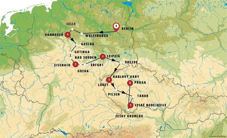 Saliendo de Leipzig, haremos una parada junto al Monumento a la Batalla de las Naciones, inaugurado en 1913 y con una altura de 91 metros, que conmemora una célebre batalla de las guerras napoleónicas. Continuamos hacia DRESDE, la capital de Sajonia, conocida por su arquitectura barroca y renacentista, sus palacios y los bonitos paseos junto al río Elba. Tras un tiempo para pasear y almorzar seguiremos hacia la región de Bohemia en Chequia. Conoceremos LOKET, pintoresca pequeña ciudad medieval rodeada casi por completo por un meandro del río Ohre. Su imponente castillo del siglo XII domina el paisaje y ofrece vistas espectaculares. Sus calles empedradas y su ambiente histórico la convierten en una joya poco conocida. Tras ello llegaremos a KARLOVY VARY, la ciudad balneario más famosa de la República Checa, célebre por sus aguas termales y elegantes edificios neobarrocos. Traslado al hotel y cena incluida.