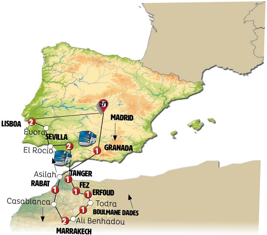 Circuito de 15 días por Andalucia, Marruecos y Portugal con Madrid, este circuito no incluye vuelos, la salida y regreso es desde Madrid.
