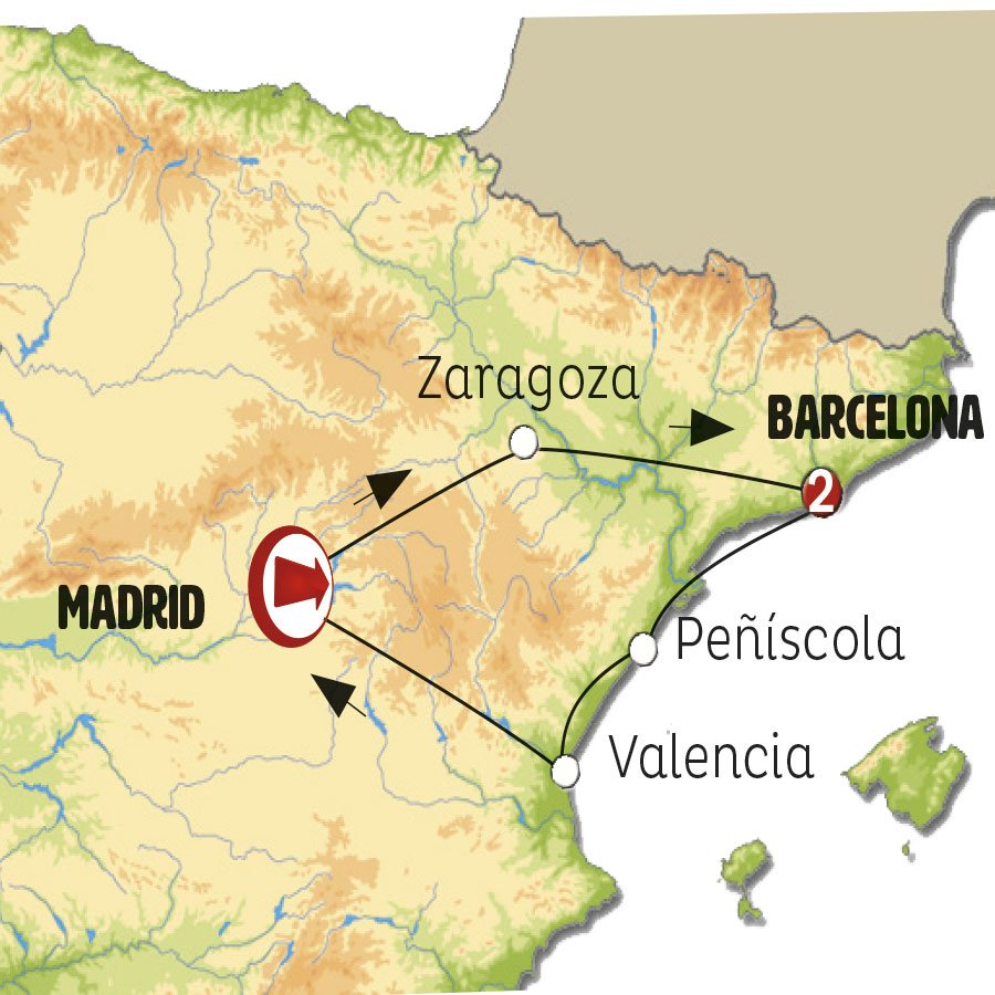 Viajamos hacia el sur siguiendo el Mediterráneo. Una parada en PEÑISCOLA, pequeña ciudad medieval amurallada rodeada por hermosas playas. Tiempo para un paseo. Seguimos a VALENCIA, ciudad portuaria de la costa levantina donde llegaremos a la hora del almuerzo. ¿Probará su paella?. Sobre las 16:30 h salimos y tras realizar una breve parada en la vanguardista Ciudad de las Artes y las Ciencias de Valencia, seguiremos hacia MADRID. Llegada prevista sobre las 20:30 / 21.00hrs. Nota: Si el número de viajeros de Valencia a Madrid es muy limitado, el viaje podrá efectuarse en tren de alta velocidad.
