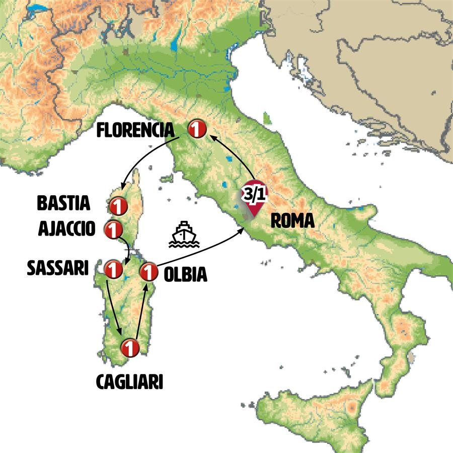 Saldremos a primera hora de Ajaccio, siguiendo la costa. En algunos tramos, disfrutaremos de paisajes de gran belleza mientras viajamos hacia BONIFACIO, una ciudad fundada en el siglo IX, cargada de historia y situada en el extremo sur de Córcega, que se alza majestuosamente sobre acantilados frente al mar. Tras un paseo, embarcaremos en un ferry que, en menos de una hora, nos llevará hacia Cerdeña. Sugerimos disfrutar de la cubierta durante la travesía (horario previsto de salida del ferry: 12:30 hrs.)Al llegar a Cerdeña, nos dirigiremos a PALAU, una encantadora ciudad costera ubicada frente al archipiélago de La Maddalena, un grupo de islas protegidas. Embarcaremos en una corta travesía de ferry de 20 minutos hacia LA MADDALENA, la principal población del archipiélago, un pintoresco pueblo con calles adoquinadas, plazas acogedoras, edificios de estilo mediterráneo y la presencia del mar en cada rincón. Tendréis tiempo para pasear y explorar. Regresaremos nuevamente a Palau y continuaremos nuestra ruta hacia SASSARI. Llegada, alojamiento y cena incluida.Nota: En ocasiones, según las condiciones del mar, el ferry puede sufrir retrasos. En ese caso, podríamos no visitar (por falta de tiempo y luz solar) Palau y La Maddalena, sustituyendo la visita por Porto Cervo, el corazón de la Costa Esmeralda. En retrasos excepcionalmente raros, podríamos ir directamente a Sassari sin visitar estos puntos, o incluso pernoctar en Bonifacio y salir hacia Cerdeña a primera hora del día siguiente.