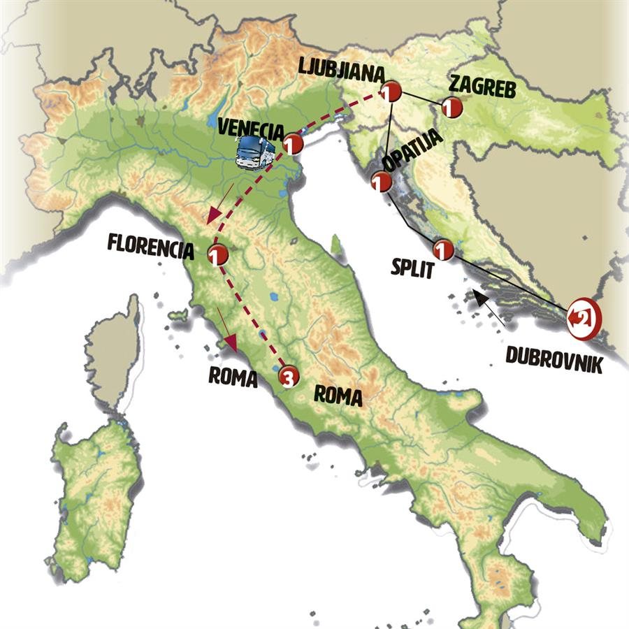Mañana libre para pasear por el bonito centro de esta pequeña capital . Por la tarde viajamos hacia el mar Adriático. Paso a Italia. VENECIA, llegada al final de la tarde. Alojamiento en la zona de Mestre.