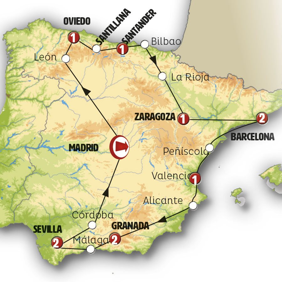 Magnifico Circuito con duración de 13 días por la España de Norte a Sur, este Circuito no incluye vuelos, puede conocer los paisajes hermosos de España, así como lo más bello como Museos y mucho más, este circuito tiene partida y regreso desde Madrid.