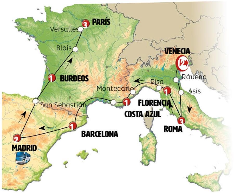 Salimos temprano de MADRID, pasos de montaña, tierras de Castilla. Hermosos paisajes en el País Vasco. SAN SEBASTIÁN, llegada a la hora del almuerzo. Tiempo para almorzar y pasear por el casco histórico o por la hermosa playa de la Concha. Continuación de ruta hacia FRANCIA. BURDEOS, llegada al final de la tarde. Sugerimos un paseo por el centro de esta ciudad declarada Patrimonio de la UNESCO.