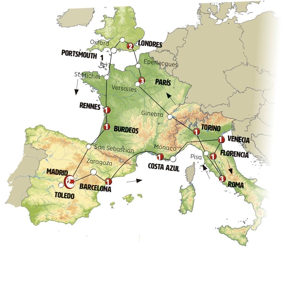 Viaje de 18 días por Europa visitando los más destacados puntos de interés europeos. Saliendo y finalizando en Madrid, pasando por diversos puntos de España, Francia, Italia y Reino Unido.