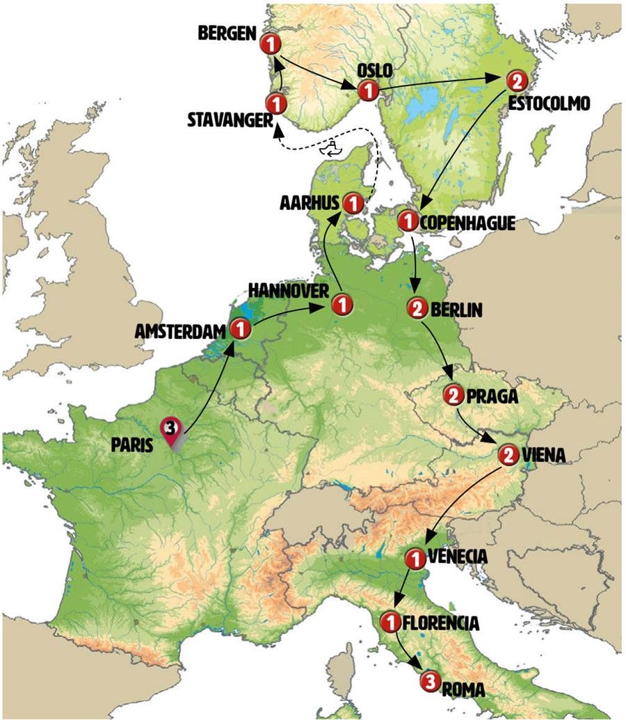 Viaje de 24 días visitando los más destacados puntos de interés europeos. Saliendo desde París y finalizando en Roma.