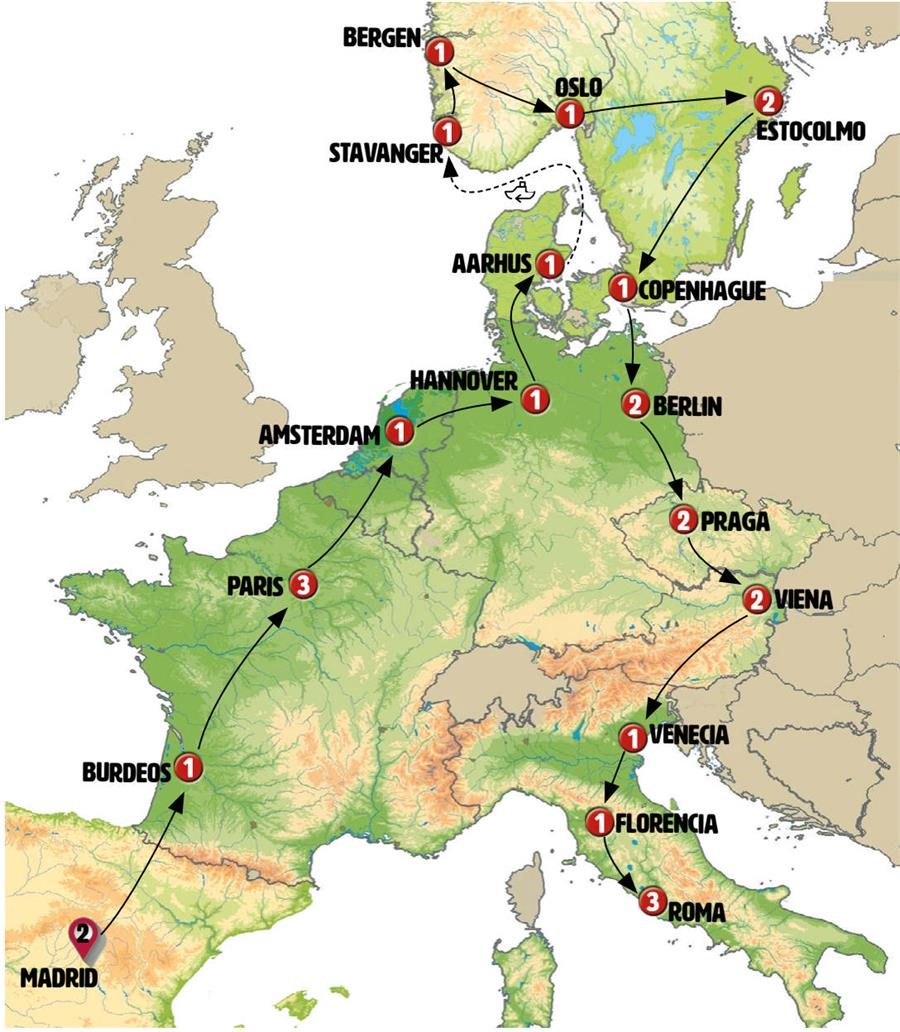 Viaje de 27 días visitando los más destacados puntos de interés europeos. Saliendo desde Madrid y finalizando en Roma.