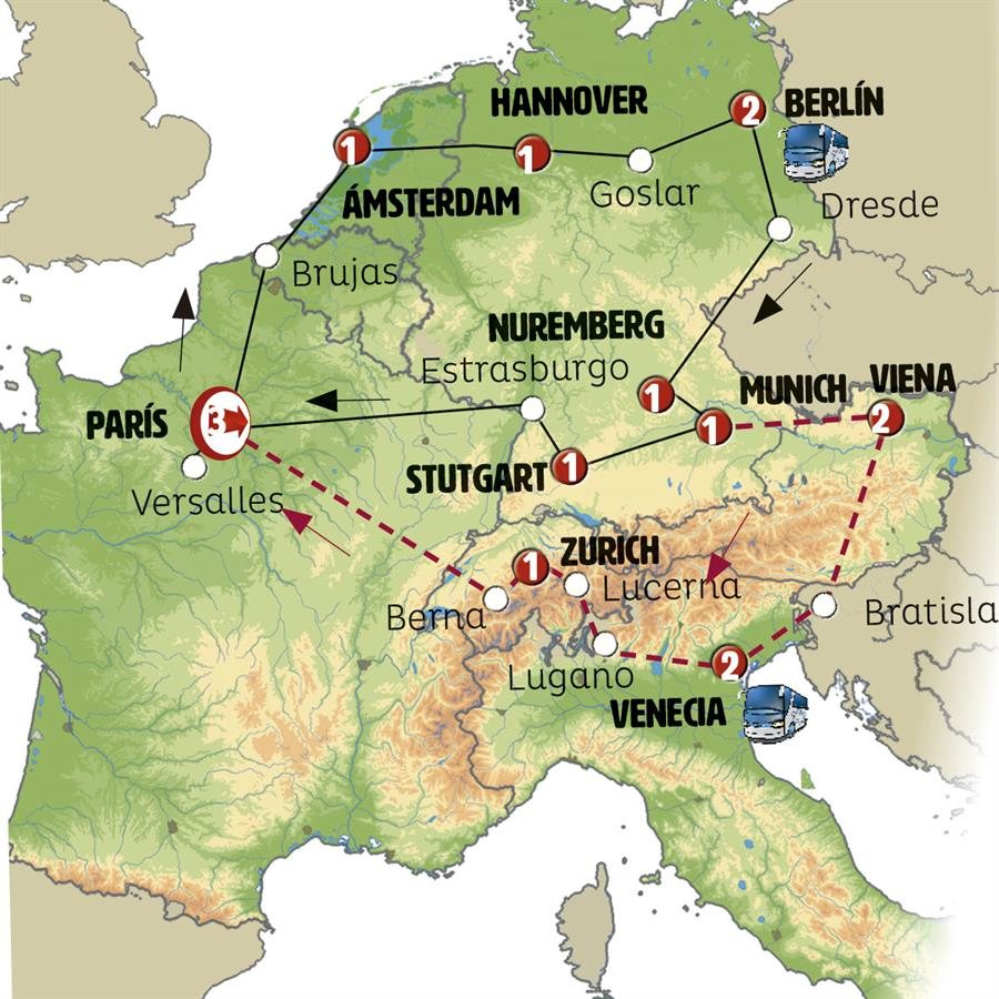Paradas en Ruta: este circuito admite la posibilidad de que usted pueda programar una o más paradas en su viaje, en la ciudad que desee por período de 1, 3, 4 o 7 noches según circuito y fechas de salida. Es fundamental que el circuito tenga salida posterior a la fecha escogida y permita la salida deseada. El suplemento por parada efectuada es de 40 Euros/52 Dólares por persona. Si la parada se realiza para tomar otro circuito del mismo proveedor no se abonará este suplemento.