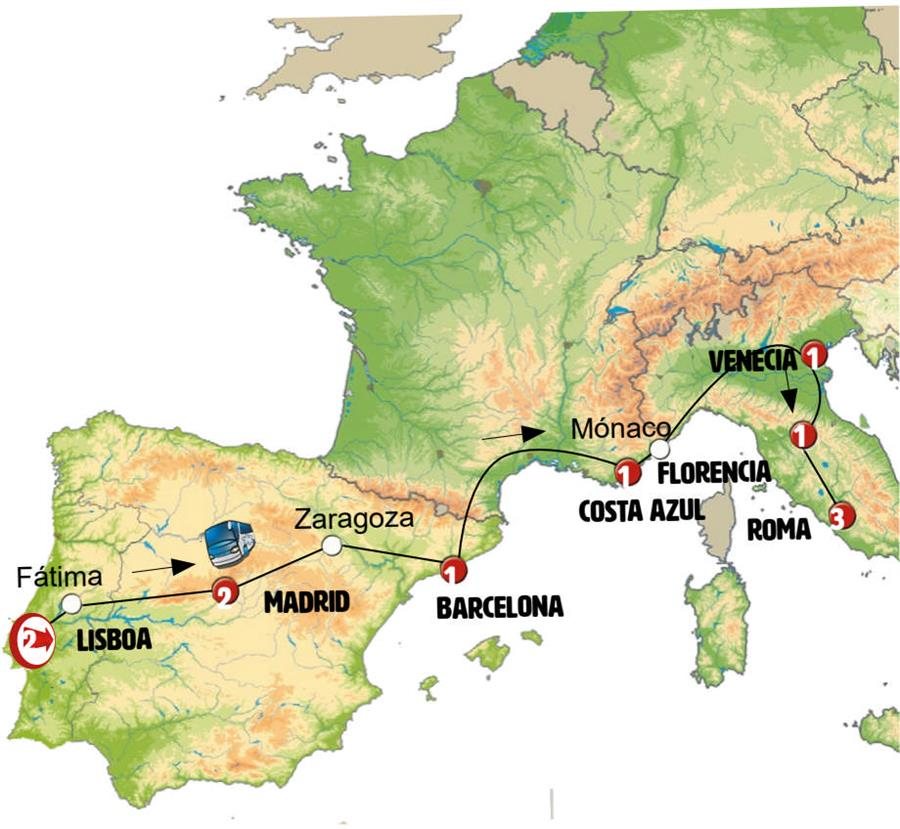 Paradas en Ruta: este circuito admite la posibilidad de que usted pueda programar una o más paradas en su viaje, en la ciudad que desee por período de 1, 3, 4 o 7 noches según circuito y fechas de salida. Es fundamental que el circuito tenga salida posterior a la fecha escogida y permita la salida deseada. El suplemento por parada efectuada es de 40 Euros/52 Dólares por persona. Si la parada se realiza para tomar otro circuito del mismo proveedor no se abonará este suplemento.