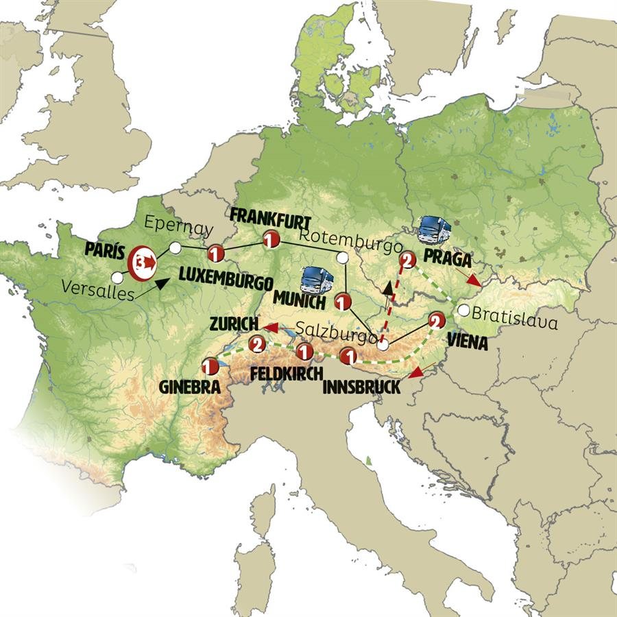 Circuito con inicio en París y finalización en Viena, con visitas y guía en español. Este circuito no incluye los vuelos, por lo que es ideal para completar su viaje por Europa o con unos vuelos low cost desde cualquier parte del mundo.