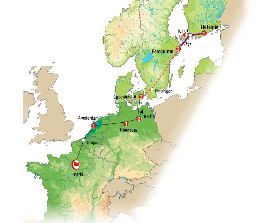Tiempo libre en BERLÍN. A las 11:30 hrs saldremos de la capital alemana viajando hacia el norte. En la ciudad de Rostock embarcamos en ferry (salida prevista 15.30 hrs) cruzando el mar Báltico hacia DINAMARCA. Travesía de casi dos horas. Disfrute de la travesía en este moderno buque. Llegada a Dinamarca, continuación a través de agradables paisajes. COPENHAGUE, llegada al final del día.