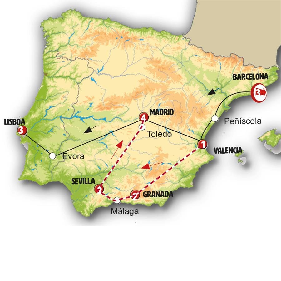 Viajamos hacia el sur siguiendo el Mediterráneo. Una parada en PEÑISCOLA, pequeña ciudad medieval amurallada rodeada por hermosas playas. Tiempo para un paseo. Seguimos a VALENCIA donde llegaremos a la hora del almuerzo. Por la tarde efectuamos una visita con guía local de esta ciudad portuaria de la costa levantina, con más de 2000 años de historia que salpican su trazado urbanístico de monumentos de todas las épocas que contrastan con la vanguardia arquitectónica de edificios como el de la Ciudad de las Artes y las Ciencias. Cena típica de gastronomía local incluida.