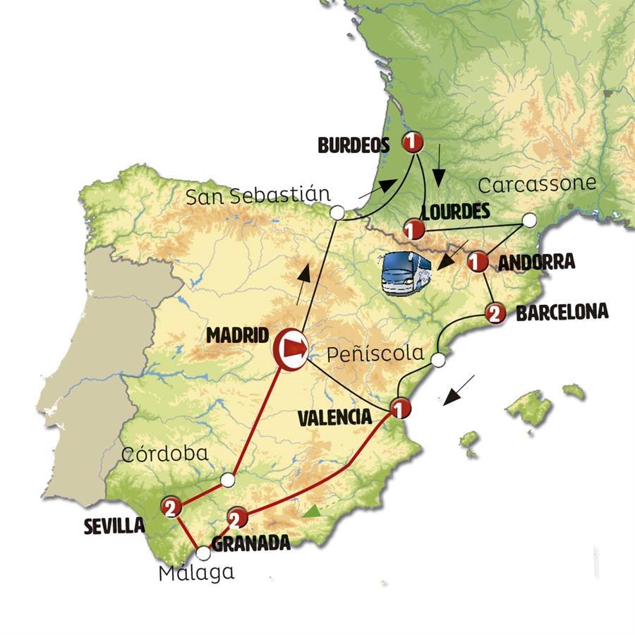 Viajamos hacia el sur siguiendo el Mediterráneo. Una parada en PEÑISCOLA, pequeña ciudad medieval amurallada rodeada por hermosas playas. Tiempo para un paseo. Seguimos a VALENCIA, ciudad portuaria de la costa levantina donde llegaremos a la hora del almuerzo. ¿Probará su paella?. Sobre las 16:30 h salimos y tras realizar una breve parada en la vanguardista Ciudad de las Artes y las Ciencias de Valencia, seguiremos hacia MADRID. Llegada prevista sobre las 20:30 / 21.00hrs. Nota: Si el número de viajeros de Valencia a Madrid es muy limitado, el viaje podrá efectuarse en tren de alta velocidad.