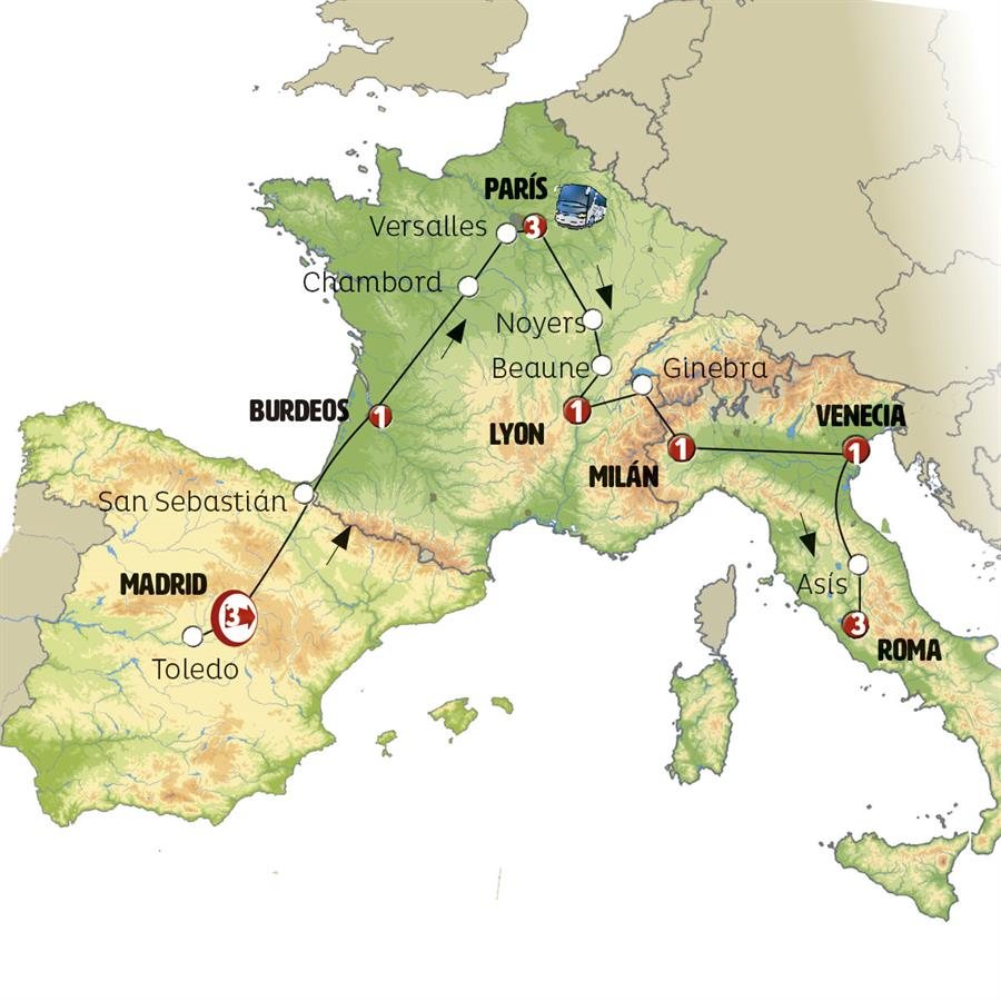 Viajamos hacia el centro de Francia. La región de Borgoña, histórica región de agradables paisajes dominados por sus viñedos donde se producen algunos de los mejores vinos del mundo. Conocemos BEAUNE en el centro de la región de los vinos, sus calles llenas de flores, su hospicio o su museo del vino pueden ser recuerdos de su viaje. Tiempo para almorzar y pasear. LYON, llegada a media tarde; la capital de la Galia Romana, a la orilla del Ródano, su centro histórico ha sido declarado Patrimonio de la Humanidad. Incluiremos la subida en funicular a Notre Dame de Fourvière, emocionante lugar con impresionante vista sobre la ciudad. Tiempo libre y alojamiento.Nota: en ocasiones, parte de los grupos estarán alojados en Chambery, ciudad próxima a Lyon. En estos casos, se saldrá al final de la tarde hacia Chambery, donde tendrán el alojamiento. A primera hora de la mañana, dispondrán de un tiempo para conocer la capital de la Saboya, ciudad de estilo medieval con hermoso casco histórico y gran castillo.