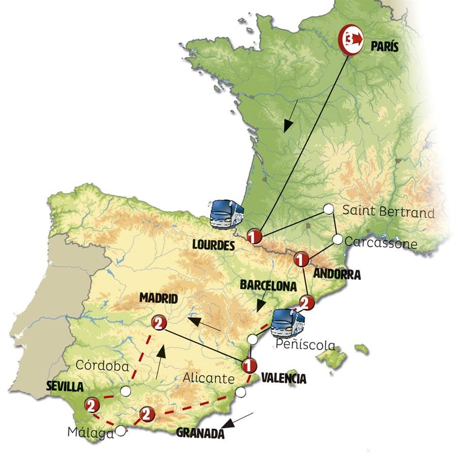 Viajamos hacia el sur siguiendo el Mediterráneo. Una parada en PEÑISCOLA, pequeña ciudad medieval amurallada rodeada por hermosas playas. Tiempo para un paseo. Seguimos a VALENCIA donde llegaremos a la hora del almuerzo. Por la tarde efectuamos una visita con guía local de esta ciudad portuaria de la costa levantina, con más de 2000 años de historia que salpican su trazado urbanístico de monumentos de todas las épocas que contrastan con la vanguardia arquitectónica de edificios como el de la Ciudad de las Artes y las Ciencias. Cena típica de gastronomía local incluida.