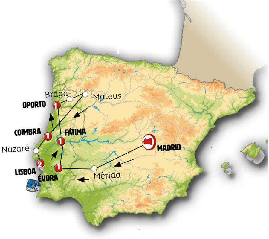 ¡Bienvenidos a su circuito de Europamundo!Salimos de Madrid, viajamos hacia la capital de Extremadura: MÉRIDA, entrada incluida al conjunto arqueológico del Teatro y Anfiteatro romanos, de excelente conservación, hoy son Patrimonio de la Humanidad. Tiempo para almorzar en el agradable centro historico peatonal con mucha vida y restaurantes. Continuando a Portugal pararemos en ÉVORA, ciudad también declarada Patrimonio de la Humanidad, con sus calles blancas, sus palacios renacentistas y su catedral. Tiempo libre. Recomendamos entrar en la Capilla de los Huesos, construida con 5000 esqueletos!.