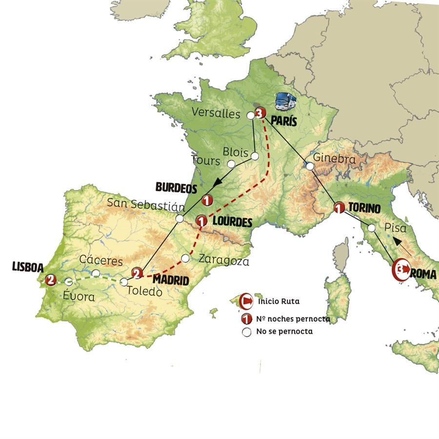 Paradas en Ruta: este circuito admite la posibilidad de que usted pueda programar una o más paradas en su viaje, en la ciudad que desee por período de 1, 3, 4 o 7 noches según circuito y fechas de salida. Es fundamental que el circuito tenga salida posterior a la fecha escogida y permita la salida deseada. El suplemento por parada efectuada es de 40 Euros/52 Dólares por persona. Si la parada se realiza para tomar otro circuito del mismo proveedor no se abonará este suplemento.