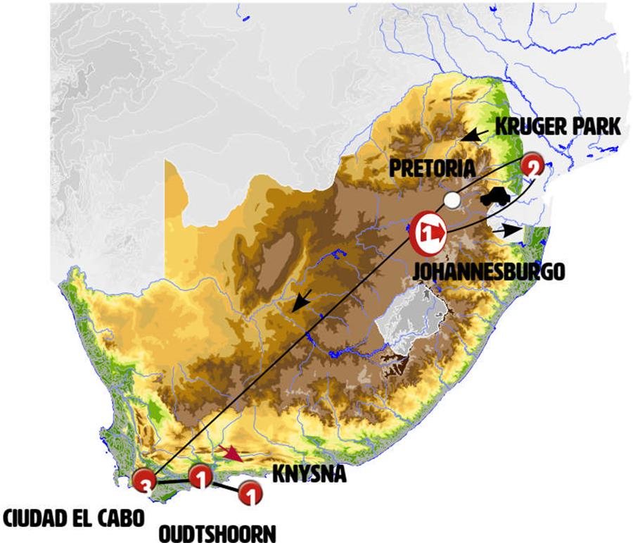 Salida por carretera hacia PRETORIA, capital administrativa de Sudáfrica y sede de varias instituciones de educación superior. Visita panorámica de esta ciudad de amplios bulevares bordeados de jacarandás. Conoceremos “Church Square”, el eje central de la ciudad, y podrá ver el edificio donde están las oficinas Presidenciales que Nelson Mandela ocupó durante su presidencia en los “Union Buildings”. Se trata de una obra maestra del arquitecto británico Herbert Baker que diseñó muchos de los edificios públicos de este país. (La visita no incluye entrada a los monumentos, sino que se contemplarán en ruta). Almuerzo libre. Llegada a Johannesburgo y traslado al aeropuerto internacional de Johannesburgo ( JNB) y salida hacia Ciudad del Cabo (vuelo NO incluido) Nota: Este vuelo tiene que ser A PARTIR DE las 19.00hrs. Llegada a CIUDAD DEL CABO y traslado al hotel. Alojamiento.