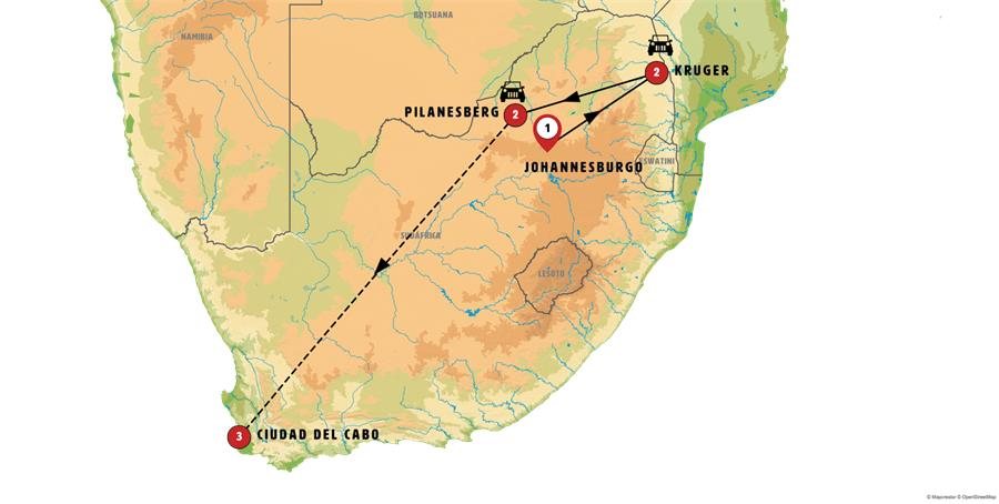 Desayuno. Día completo de SAFARI por el Parque Nacional Kruger en vehículo abierto 4X4. Éste es uno de los parques naturales más célebres del mundo, figura entre los más grandes de África Austral y de los parques más antiguos del continente africano, a punto de cumplir un siglo de existencia. Aquí pueden verse los Cinco Grandes (leones, leopardos, elefantes, búfalos y rinocerontes), así como guepardos, jirafas, hipopótamos y toda clase de antílopes y animales menores. El parque abarca 350 Km2. junto a la frontera con Mozambique. Alrededor de 2000 Km. de carreteras recorren el interior. Almuerzo libre. Regreso al hotel por la tarde. Cena incluida y alojamiento. Nota: El hotel proveerá cajas de pic nic con el desayuno debido a que la hora estimada de salida para realizar esta actividad es a las 05:30 horas (aproximadamente). Almuerzo (no incluido): se para en uno de los campamentos dentro del parque donde el pasajero tiene la opción de comer en restaurante o en una cafetería. Dentro del Parque Kruger no se permite abandonar las carreteras.Nota: Los safaris se realizan en vehiculo abierto 4x4 con guia de habla Española. En el caso de ser más de 9 personas, el guia se irá turnando entre los distintos vehiculos y es posible que en ocasiones las explicaciones sean en inglés.Es costumbre dar propina al chofer y al guia. Niños menores de 8 años no pueden ir en el tour del parque Kruger.