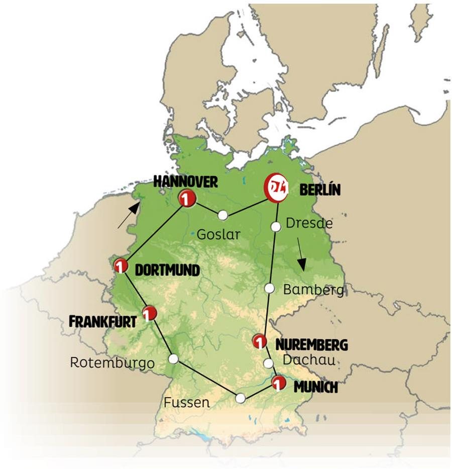 Viajamos a DRESDE, la capital de Sajonia, conocida por su arquitectura barroca y renacentista, sus palacios y los bonitos paseos junto al río Elba. Seguimos hacia Baviera. Llegada a BAMBERG hermosísima ciudad llena de vida; no deje de pasear por la pequeña Venecia. Continuamos a NUREMBERG, la segunda ciudad de Baviera, ciudad de larga historia donde sugerimos visitar el punto donde se encontraba el Coliseo de Hitler.