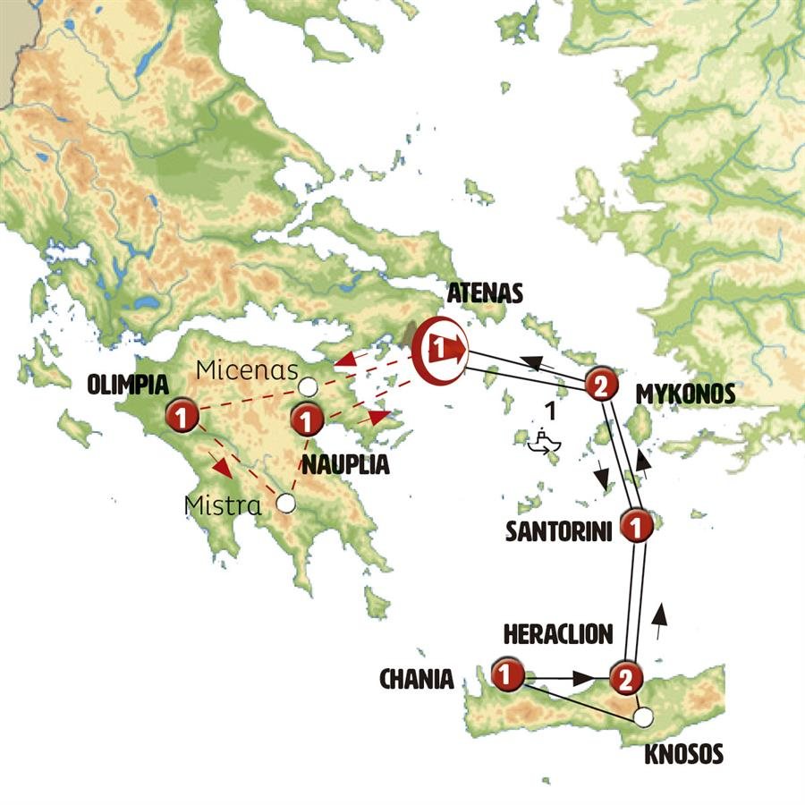 Hoy incluimos excursión (entrada y visita guiada) al PALACIO DE CNOSOS, que nos permitirá conocer la cultura minoica que dió origen a la griega hace cuatro mil años. Tras la visita cruzamos las altas montañas del centro de la isla, viajamos a la zona sur, junto al mar de Libia conocemos AGIA GALINI, pintoresco pueblo de laberínticas callejuelas, puerto pesquero y populares tabernas. Tiempo para almorzar y si lo desea, bañarse en el mar. Regreso a la capital de Creta.Nota: Desde noviembre hasta abril, la parada se realizará en la pintoresca ciudad de Matala en lugar de Agia Galini debido al fin de la temporada estival y el cierre generalizado de comercios en esta ciudad.