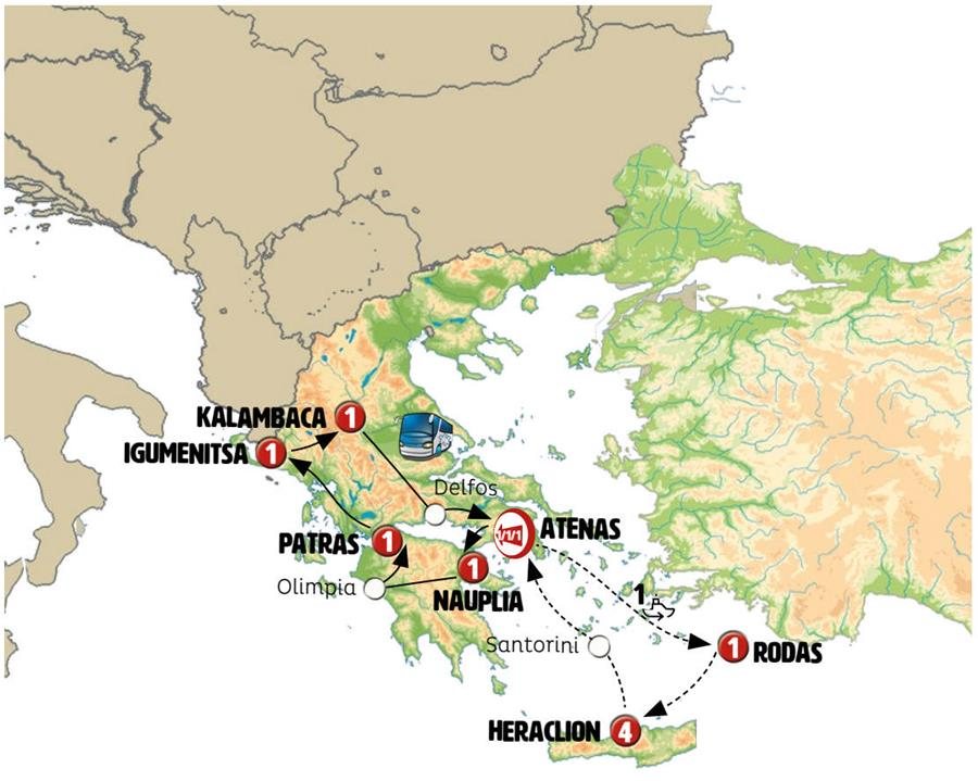 Viajamos entre montañas por el interior del Peloponeso hacia TRIPOLI. Parada en la activa capital de la región de Arcadia, con tiempo para pasear por la zona de la Plaza Areos con sus cafés y restaurantes. Continuamos ruta hacia OLIMPIA, conoceremos el recinto arqueológico (entrada y visita con guía local incluida), el lugar donde se celebraron los primeros juegos Olímpicos en el año 776 a.C., participando atletas de toda Grecia y sus colonias. Destaca el Templo de Zeus, el estadio, el gimnasio y la palestra. Continuamos hacia PATRAS, la tercera ciudad de Grecia en población, ciudad portuaria con mucha vida, una fortaleza medieval domina la ciudad, su catedral es la mayor iglesia de Grecia, junto a ella la pequeña iglesia de San Andres es lugar de peregrinación. Cena incluida.