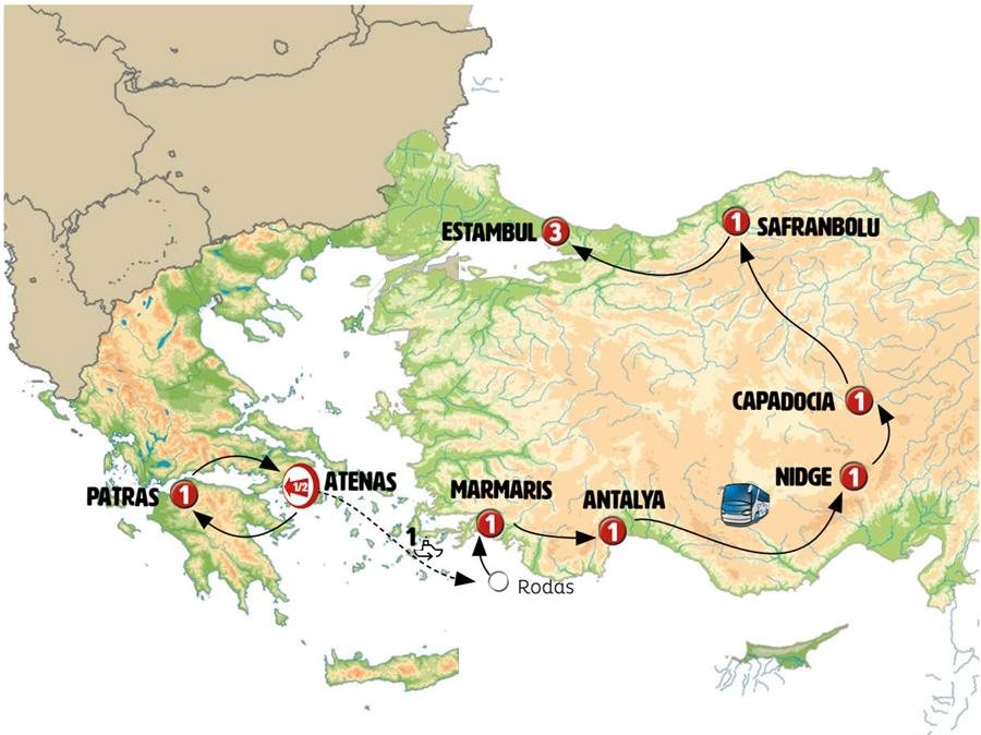 Llegada a Rodas al inicio de la mañana. Incluimos una visita de la ciudad con su impresionante ciudadela amurallada, su casco antiguo que nos muestra las huellas de las diferentes culturas que la habitaron (griegos, romanos, bizantinos, caballeros de San Juan, otomanos, italianos...). Por la tarde, sobre las 16.00 hrs, embarcamos en ferry rápido hacia TURQUÍA. Travesía de una hora. MÁRMARIS, bellísimo enclave turístico costero con su castillo, su marina y sus fuentes. Alojamiento en la región de Mármaris y Cena incluida. NOTA IMPORTANTE: Los ferris que comunican Rodas con Mármaris sufren modificaciones de horarios con frecuencia y no operan todos los días (excepto meses de verano), el itinerario podrá ser adaptado en base a las frecuencias existentes durante su viaje.