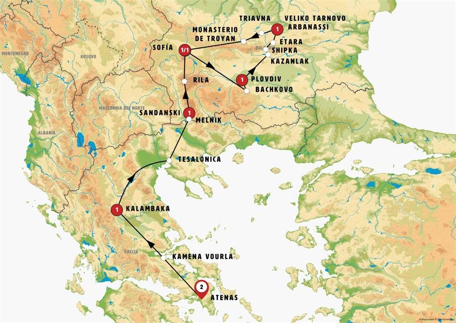 Viajamos por el norte de Grecia, entre bonitos paisajes de montañas, hacia el mar Egeo. TESALÓNICA –Llegada-, tiempo para pasear y almorzar en la segunda de Grecia. Tras ello seguimos nuestra ruta hacia BULGARIA, paso de frontera. En la macedonia búlgara paramos en MELNIK, pintoresco pueblo-museo entre hermosos paisajes en el centro de una zona productora de vinos. SANDANSKI, llegada a esta hermosa pequeña ciudad termal, aquí nació Espartaco, cena y alojamiento.