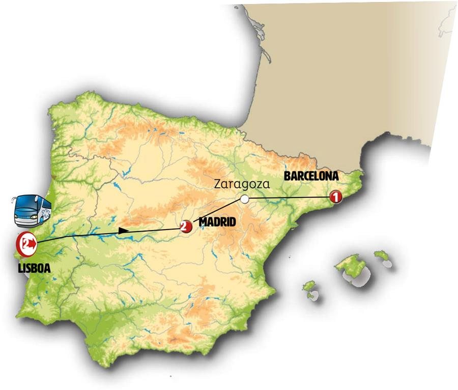 Recorrido por la península Ibérica, desde Lisboa en Portugal pasando por Fátima, llegando al corazón de la península en Madrid y continuando hasta la orilla del mar Mediterráneo en Barcelona.