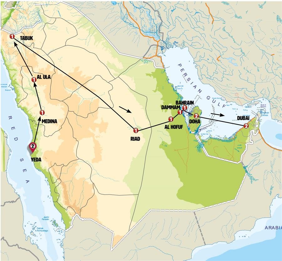 Tras el desayuno visitamos la ciudad. Conocemos el Ibrahim Palace, fortaleza histórica (Patrimonio de la Humanidad) dominada por su blanca mezquita, construido en el año 1556 por los otomanos. Tras ello conocemos “House of Allegiance” que nos muestra un pequeño palacio característico del oasis. Nos acercaremos hasta la animada zona donde se levanta el Palacio de Mulhaires, con sus numerosos restaurantes, tiendas y parques donde acude la población local. Posteriormente continuamos por el oasis hacia a AL QARA, un lugar histórico y zona paisajística espectacular de laberintos, mini-desfiladeros y cuevas en la montaña, que le parecerá como si penetrase en la montaña. La temperatura es constante durante todo el año la temperatura y ronda los 25 grados. Aprovecharemos también para conocer su museo “Tierra de civilizaciones” que nos describe la historia de la zona.Por la tarde seguimos nuestra ruta hacia el Golfo Persico. Nos sorprenderá la moderna ciudad de DAMMAM, capital provincial de casi un millón de habitantes. Antes de llegar pararemos en el impresionante recinto de Ithra y su modernísimo King Abdulaziz Center for World Culture- un lugar con forma de roca, arquitectónicamente muy llamativo y que dispone de zonas de ocio, museos y biblioteca. Ya en Dammam, junto al mar, haremos una breve parada para ver la torre del agua de Khobar. Siguiendo su moderno paseo marítimo llegaremos al Heritage Village, que con forma de fortaleza junto al mar nos invita a conocer la civilización saudí. Aquí conocemos su pequeño museo de objetos antiguos, incluyendo su colección de automóviles históricos. Cena incluida. Nota: en el momento de efectuarse este itinerario el Palacio Ibrahim se encontraba cerrado por restauración. Durante el tiempo que se mantenga cerrado se conocerá desde el exterior.