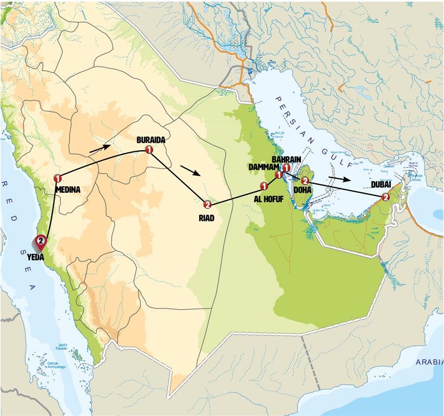 Tras el desayuno visitamos la ciudad. Conocemos el Ibrahim Palace, fortaleza histórica (Patrimonio de la Humanidad) dominada por su blanca mezquita, construido en el año 1556 por los otomanos. Tras ello conocemos “House of Allegiance” que nos muestra un pequeño palacio característico del oasis. Nos acercaremos hasta la animada zona donde se levanta el Palacio de Mulhaires, con sus numerosos restaurantes, tiendas y parques donde acude la población local. Posteriormente continuamos por el oasis hacia a AL QARA, un lugar histórico y zona paisajística espectacular de laberintos, mini-desfiladeros y cuevas en la montaña, que le parecerá como si penetrase en la montaña. La temperatura es constante durante todo el año la temperatura y ronda los 25 grados. Aprovecharemos también para conocer su museo “Tierra de civilizaciones” que nos describe la historia de la zona.Por la tarde seguimos nuestra ruta hacia el Golfo Persico. Nos sorprenderá la moderna ciudad de DAMMAM, capital provincial de casi un millón de habitantes. Antes de llegar pararemos en el impresionante recinto de Ithra y su modernísimo King Abdulaziz Center for World Culture- un lugar con forma de roca, arquitectónicamente muy llamativo y que dispone de zonas de ocio, museos y biblioteca. Ya en Dammam, junto al mar, haremos una breve parada para ver la torre del agua de Khobar. Siguiendo su moderno paseo marítimo llegaremos al Heritage Village, que con forma de fortaleza junto al mar nos invita a conocer la civilización saudí. Aquí conocemos su pequeño museo de objetos antiguos, incluyendo su colección de automóviles históricos. Cena incluida. Nota: en el momento de efectuarse este itinerario el Palacio Ibrahim se encontraba cerrado por restauración. Durante el tiempo que se mantenga cerrado se conocerá desde el exterior.