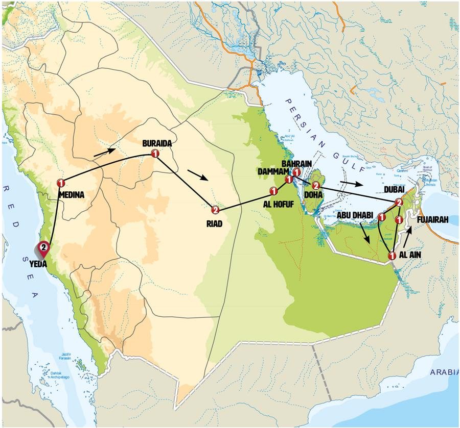 Tras el desayuno visitamos la ciudad. Conocemos el Ibrahim Palace, fortaleza histórica (Patrimonio de la Humanidad) dominada por su blanca mezquita, construido en el año 1556 por los otomanos. Tras ello conocemos “House of Allegiance” que nos muestra un pequeño palacio característico del oasis. Nos acercaremos hasta la animada zona donde se levanta el Palacio de Mulhaires, con sus numerosos restaurantes, tiendas y parques donde acude la población local. Posteriormente continuamos por el oasis hacia a AL QARA, un lugar histórico y zona paisajística espectacular de laberintos, mini-desfiladeros y cuevas en la montaña, que le parecerá como si penetrase en la montaña. La temperatura es constante durante todo el año la temperatura y ronda los 25 grados. Aprovecharemos también para conocer su museo “Tierra de civilizaciones” que nos describe la historia de la zona.Por la tarde seguimos nuestra ruta hacia el Golfo Persico. Nos sorprenderá la moderna ciudad de DAMMAM, capital provincial de casi un millón de habitantes. Antes de llegar pararemos en el impresionante recinto de Ithra y su modernísimo King Abdulaziz Center for World Culture- un lugar con forma de roca, arquitectónicamente muy llamativo y que dispone de zonas de ocio, museos y biblioteca. Ya en Dammam, junto al mar, haremos una breve parada para ver la torre del agua de Khobar. Siguiendo su moderno paseo marítimo llegaremos al Heritage Village, que con forma de fortaleza junto al mar nos invita a conocer la civilización saudí. Aquí conocemos su pequeño museo de objetos antiguos, incluyendo su colección de automóviles históricos. Cena incluida. Nota: en el momento de efectuarse este itinerario el Palacio Ibrahim se encontraba cerrado por restauración. Durante el tiempo que se mantenga cerrado se conocerá desde el exterior.