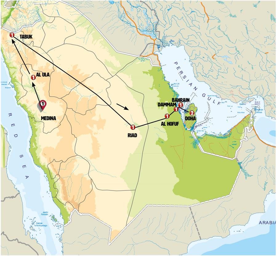 Tras el desayuno visitamos la ciudad. Conocemos el Ibrahim Palace, fortaleza histórica (Patrimonio de la Humanidad) dominada por su blanca mezquita, construido en el año 1556 por los otomanos. Tras ello conocemos “House of Allegiance” que nos muestra un pequeño palacio característico del oasis. Nos acercaremos hasta la animada zona donde se levanta el Palacio de Mulhaires, con sus numerosos restaurantes, tiendas y parques donde acude la población local. Posteriormente continuamos por el oasis hacia a AL QARA, un lugar histórico y zona paisajística espectacular de laberintos, mini-desfiladeros y cuevas en la montaña, que le parecerá como si penetrase en la montaña. La temperatura es constante durante todo el año la temperatura y ronda los 25 grados. Aprovecharemos también para conocer su museo “Tierra de civilizaciones” que nos describe la historia de la zona.Por la tarde seguimos nuestra ruta hacia el Golfo Persico. Nos sorprenderá la moderna ciudad de DAMMAM, capital provincial de casi un millón de habitantes. Antes de llegar pararemos en el impresionante recinto de Ithra y su modernísimo King Abdulaziz Center for World Culture- un lugar con forma de roca, arquitectónicamente muy llamativo y que dispone de zonas de ocio, museos y biblioteca. Ya en Dammam, junto al mar, haremos una breve parada para ver la torre del agua de Khobar. Siguiendo su moderno paseo marítimo llegaremos al Heritage Village, que con forma de fortaleza junto al mar nos invita a conocer la civilización saudí. Aquí conocemos su pequeño museo de objetos antiguos, incluyendo su colección de automóviles históricos. Cena incluida. Nota: en el momento de efectuarse este itinerario el Palacio Ibrahim se encontraba cerrado por restauración. Durante el tiempo que se mantenga cerrado se conocerá desde el exterior.