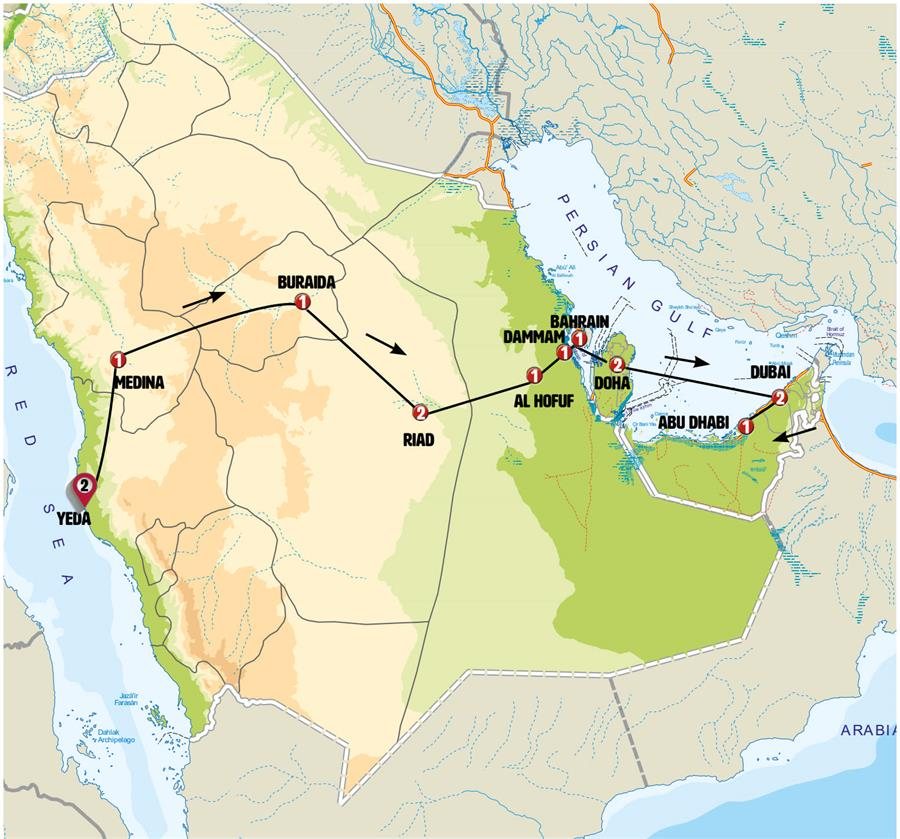Tras el desayuno visitamos la ciudad. Conocemos el Ibrahim Palace, fortaleza histórica (Patrimonio de la Humanidad) dominada por su blanca mezquita, construido en el año 1556 por los otomanos. Tras ello conocemos “House of Allegiance” que nos muestra un pequeño palacio característico del oasis. Nos acercaremos hasta la animada zona donde se levanta el Palacio de Mulhaires, con sus numerosos restaurantes, tiendas y parques donde acude la población local. Posteriormente continuamos por el oasis hacia a AL QARA, un lugar histórico y zona paisajística espectacular de laberintos, mini-desfiladeros y cuevas en la montaña, que le parecerá como si penetrase en la montaña. La temperatura es constante durante todo el año la temperatura y ronda los 25 grados. Aprovecharemos también para conocer su museo “Tierra de civilizaciones” que nos describe la historia de la zona.Por la tarde seguimos nuestra ruta hacia el Golfo Persico. Nos sorprenderá la moderna ciudad de DAMMAM, capital provincial de casi un millón de habitantes. Antes de llegar pararemos en el impresionante recinto de Ithra y su modernísimo King Abdulaziz Center for World Culture- un lugar con forma de roca, arquitectónicamente muy llamativo y que dispone de zonas de ocio, museos y biblioteca. Ya en Dammam, junto al mar, haremos una breve parada para ver la torre del agua de Khobar. Siguiendo su moderno paseo marítimo llegaremos al Heritage Village, que con forma de fortaleza junto al mar nos invita a conocer la civilización saudí. Aquí conocemos su pequeño museo de objetos antiguos, incluyendo su colección de automóviles históricos. Cena incluida. Nota: en el momento de efectuarse este itinerario el Palacio Ibrahim se encontraba cerrado por restauración. Durante el tiempo que se mantenga cerrado se conocerá desde el exterior.