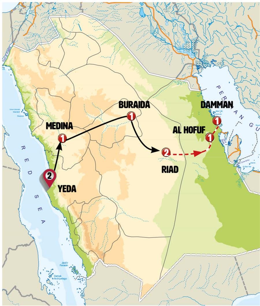 Bienvenido a Arabia Saudita, un país de contrastes que le dejará asombrosos recuerdos. Traslado a su hotel en YEDA, a orillas del mar Rojo, la segunda ciudad del país, con cuatro millones de habitantes.19.00 hrs.- Nos encontramos con nuestro guía en la recepción del hotel. Daremos un paseo por su centro histórico, más conocido como Al-Balad, declarado patrimonio de la Humanidad por la UNESCO, con su impresionante conjunto de callejones medievales y sus casas hechas con coral y balcones de madera. La iluminación del barrio por la noche lo hace especialmente atractivo y existen muy agradables restaurantes.