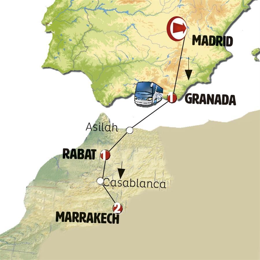 Salida de Granada. Atravesamos la Costa del Sol. En Algeciras o Tarifa embarcamos en moderno ferry cruzando el Estrecho de Gibraltar (ticket incluido). Normalmente el autocar no será embarcado debiendo llevar cada pasajero su equipaje. Llegada a Marruecos. Bonitos paisajes. ASILAH.- Pintoresca pequeña ciudad amurallada frente al Atlántico, fue un antiguo puerto de piratas, hoy la población tiene mucha vida. Tiempo para almorzar. Seguimos posteriormente hacia RABAT, llegada. Cena incluida.