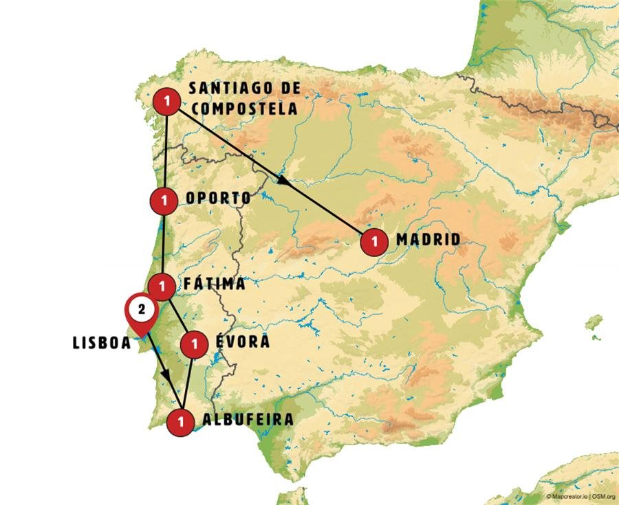 Hoy viajamos entre bonitos paisajes de Alentejo. Paramos en MARVAO, pueblo amurallado muy pintoresco que nos ofrece una fantástica panorámica de la región. Tras ello, conocemos CASTELO DA VIDE con su gran castillo. Tendremos tiempo además para caminar por su antigua judería donde podemos visitar la sinagoga medieval (hoy museo) o por el laberinto de callejuelas de la población. Tras la hora del almuerzo continuamos a TOMAR, ciudad dominada por el Convento de Cristo, antiguo castillo-convento de los templarios, entrada incluida. Antes de llegar a Fátima, pararemos en ALJUSTREL, la aldea donde nacieron los tres pastorcitos que presenciaron a la Virgen. Podremos ver la casa de Lucía. Llegada a FÁTIMA y tiempo libre en el Santuario de Fátima donde, si lo desea, podrá presenciar la procesión de las velas (no se celebra en invierno). Cena incluida.