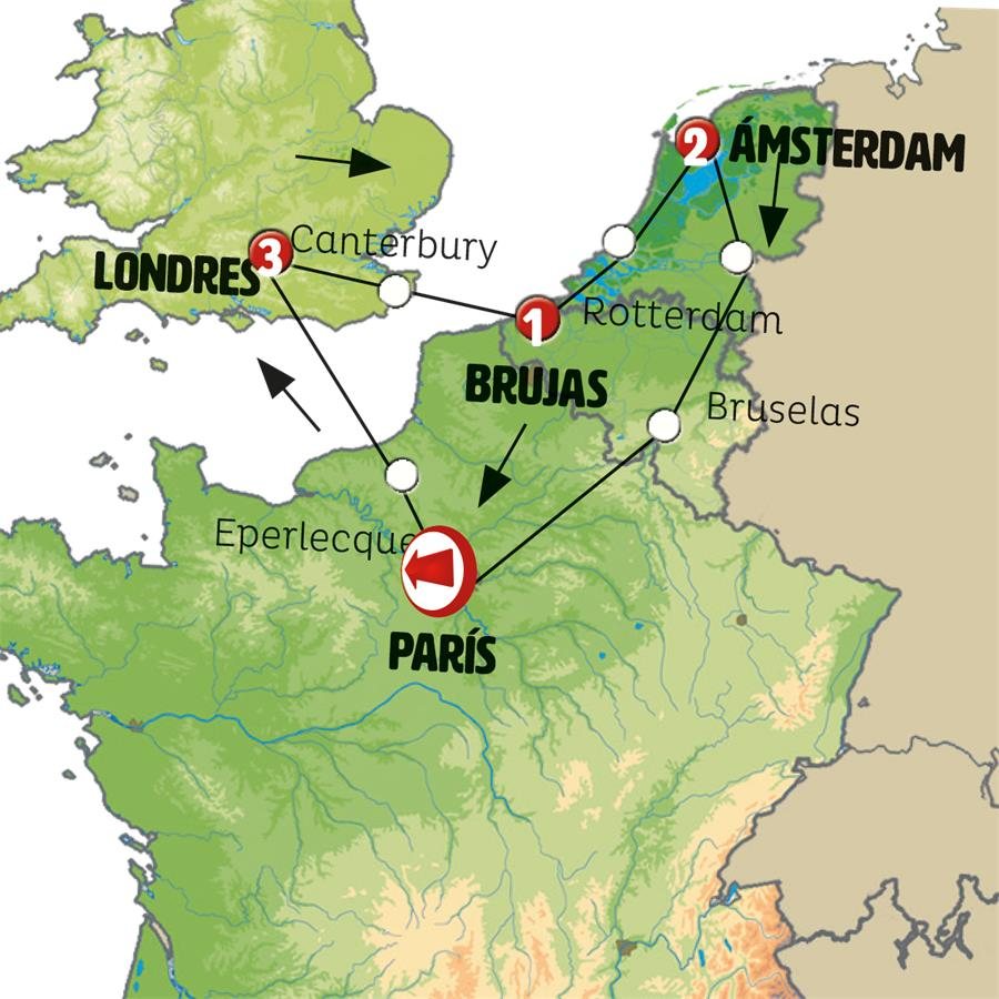 Saldremos de Londres, placidos paisajes de verdes colinas en el sur de Inglaterra. Tramites fronterizos antes de nuestro embarque hacia Calais. Agradable travesía en moderno ferry cruzando el Canal de la Mancha, ¡disfrute del ferry y del aire del oceano!. Llegada a Francia y continuacion hacia Bélgica. BRUJAS, la encantadora y mundialmente conocida ciudad flamenca de hermosos canales.