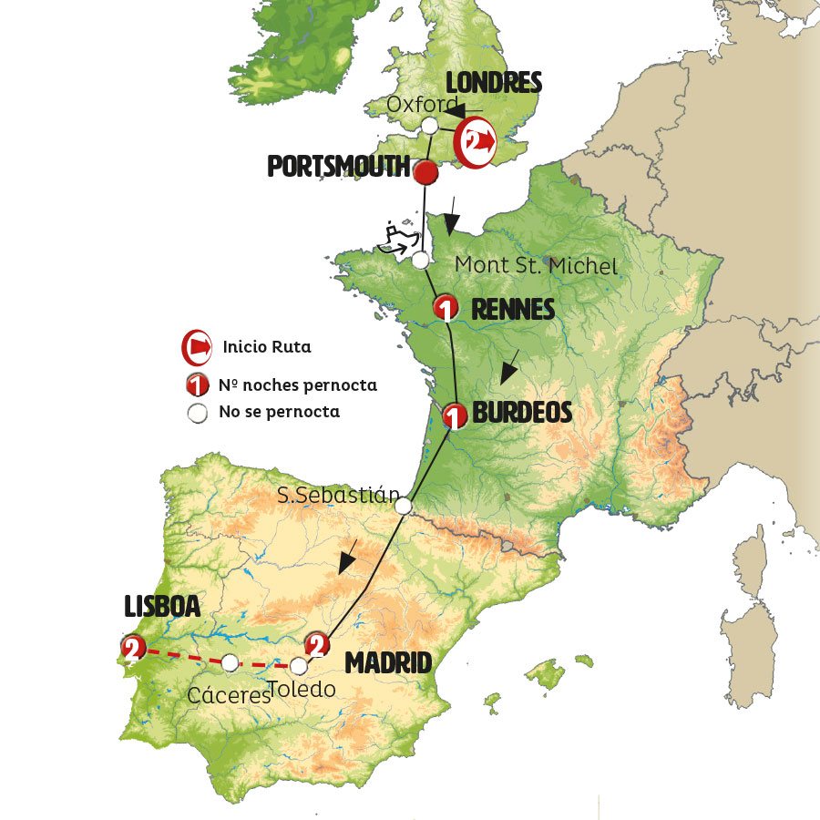 Circuito de viaje en autobús con salida desde Londres y recorrido por España hasta Madrid.