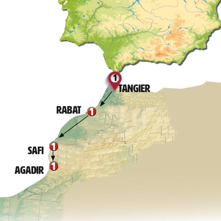 Con nuestro guía conocemos SAFI, esta ciudad es conocida por su producción de cerámica, muy demandada en todo Marruecos por su calidad y vivos colores. Fotografiaremos el castillo del mar, la muralla con su potente fortaleza, pasearemos un poco por su atractiva Medina y conoceremos la “colina de los ceramistas” con sus múltiples tiendas. Continuamos tras ello hacia ESSAUIRA, su Medina amurallada, frente al mar, ha sido declarada patrimonio de la humanidad por la Unesco. La ciudad magníficamente conservada, es lugar elegido por artistas y pintores. Tendrá tiempo libre para almorzar y pasear por sus estrechas calles, casas encaladas y potentes murallas azotadas por las olas. Tras la hora del almuerzo continuamos siguiendo la costa Atlántica, con magníficos paisajes en algunos lugares. Una breve parada en TAGHAZOUT, pintoresca pequeña población que vive de la pesca y de los turistas que viene a practicar el surf. Continuación a AGADIR, llegada, cena y alojamiento.