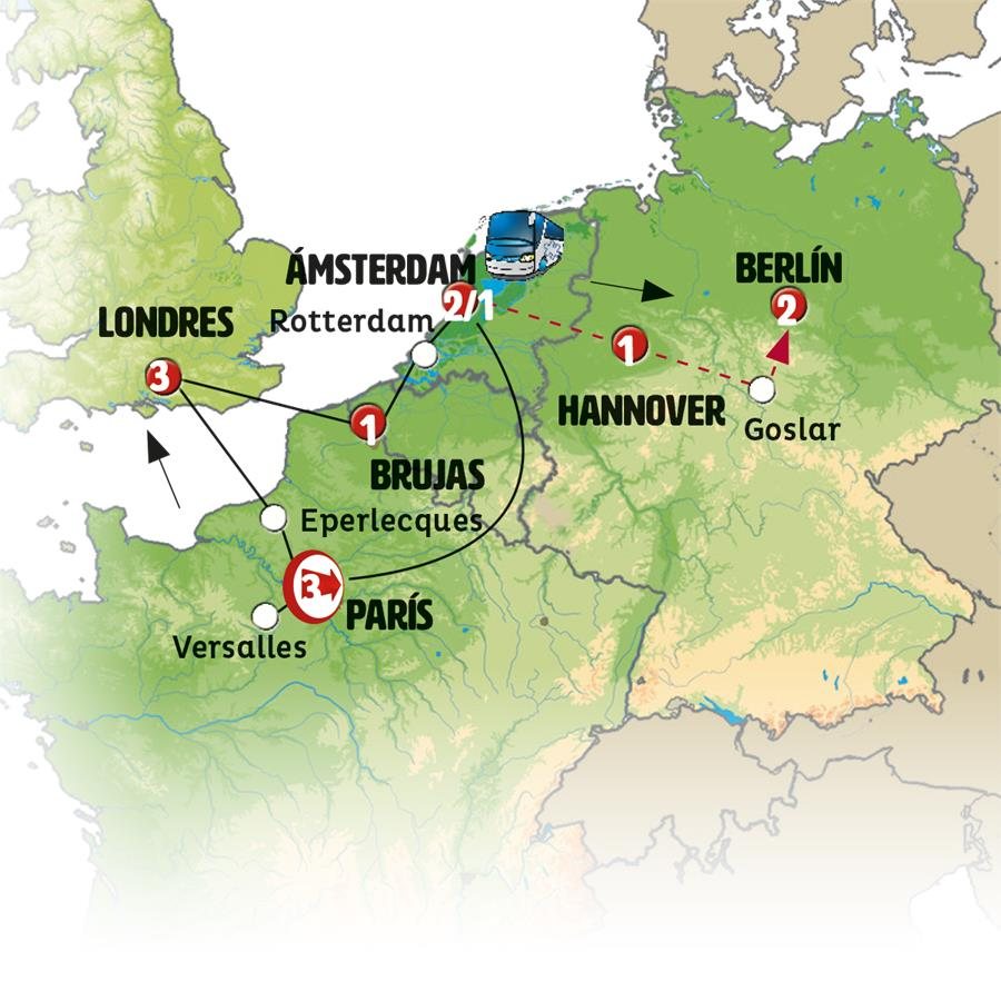 Saldremos de Londres, placidos paisajes de verdes colinas en el sur de Inglaterra. Tramites fronterizos antes de nuestro embarque hacia Calais. Agradable travesía en moderno ferry cruzando el Canal de la Mancha, ¡disfrute del ferry y del aire del oceano!. Llegada a Francia y continuacion hacia Bélgica. BRUJAS, la encantadora y mundialmente conocida ciudad flamenca de hermosos canales.